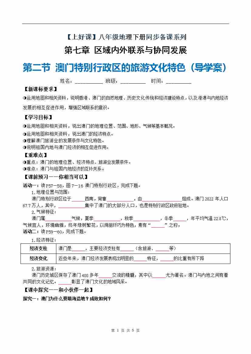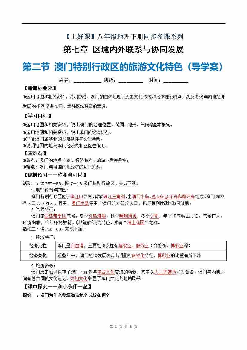 7.2 澳门特别行政区的旅游文化特色(导学案)(原卷版)