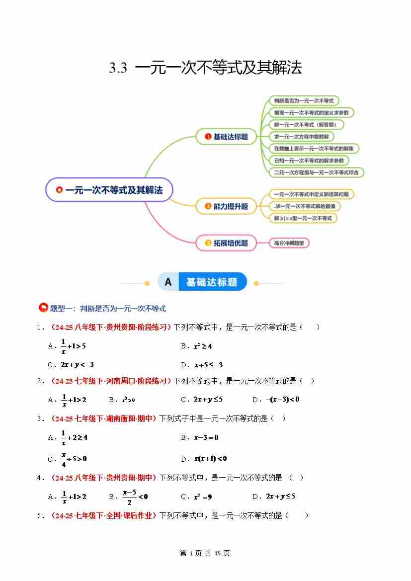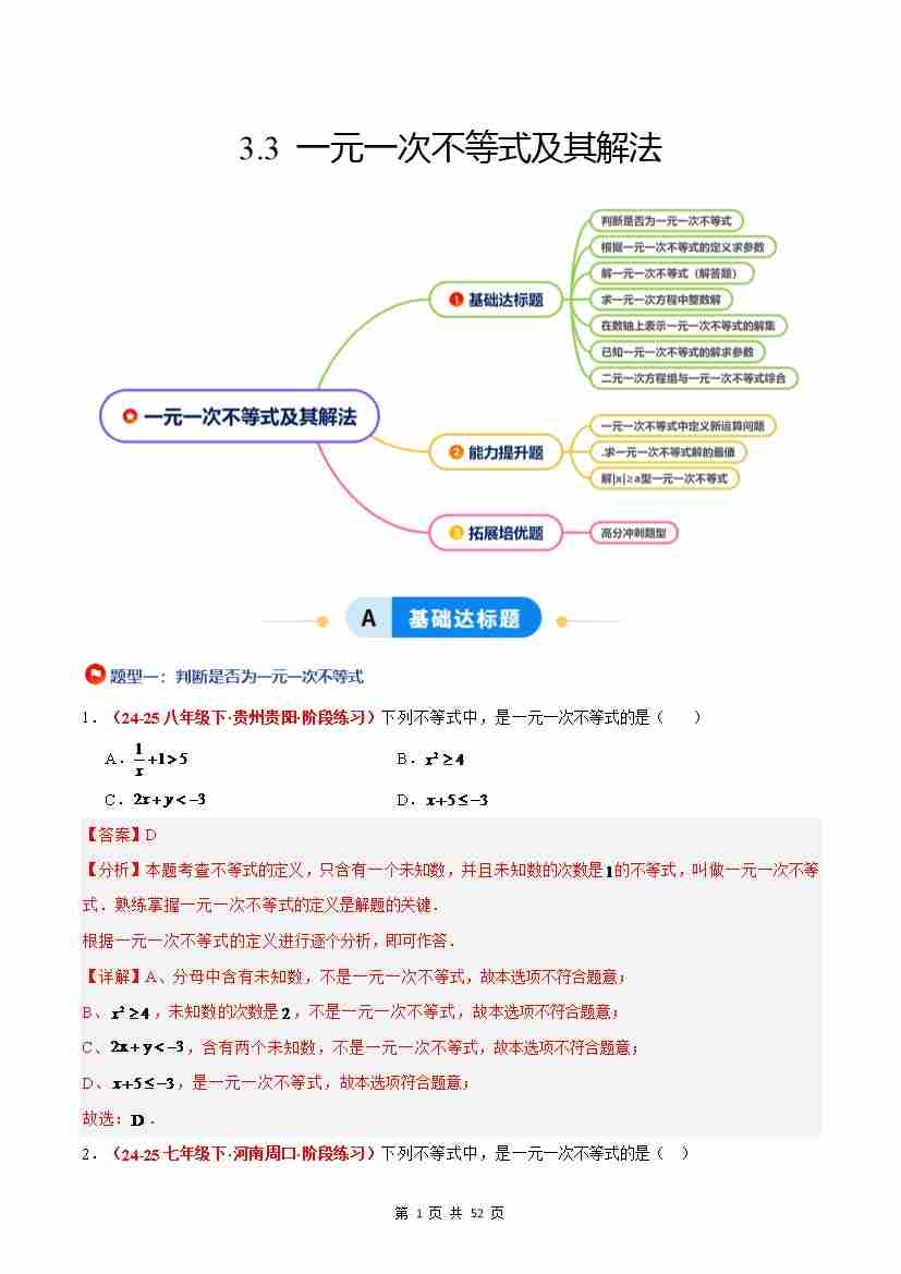 3.3 一元一次不等式及其解法(7大基础题型3大巩固提升)(题型专练)(原卷版)