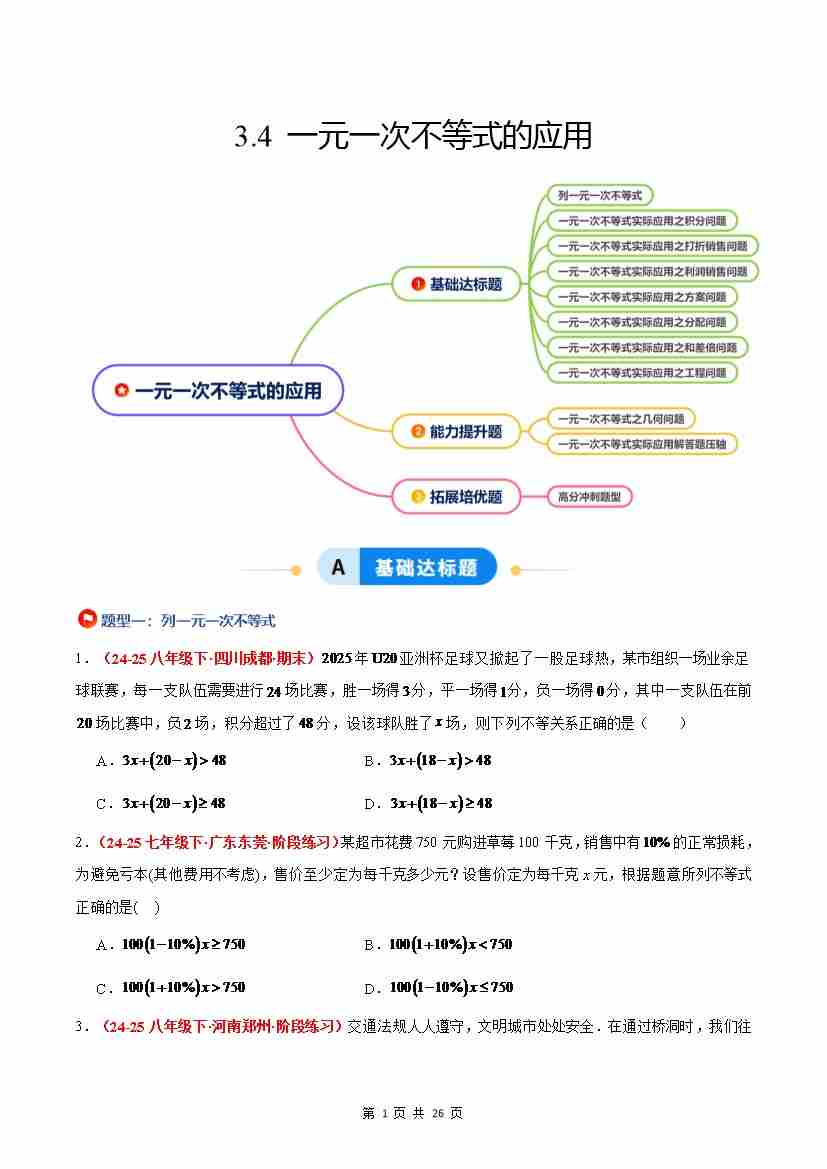 3.4 一元一次不等式的应用(8大基础题型2大巩固提升)(题型专练)(原卷版)