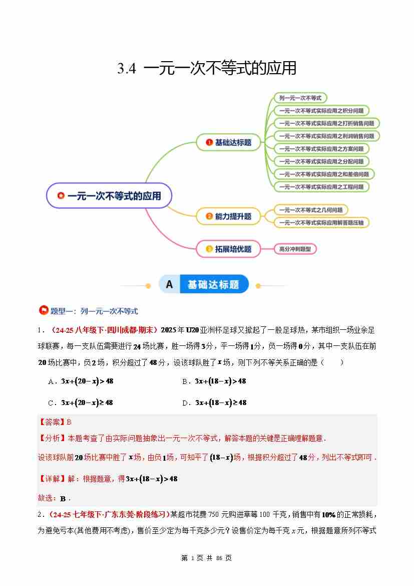 3.4 一元一次不等式的应用(8大基础题型2大巩固提升)(题型专练)(解析版)