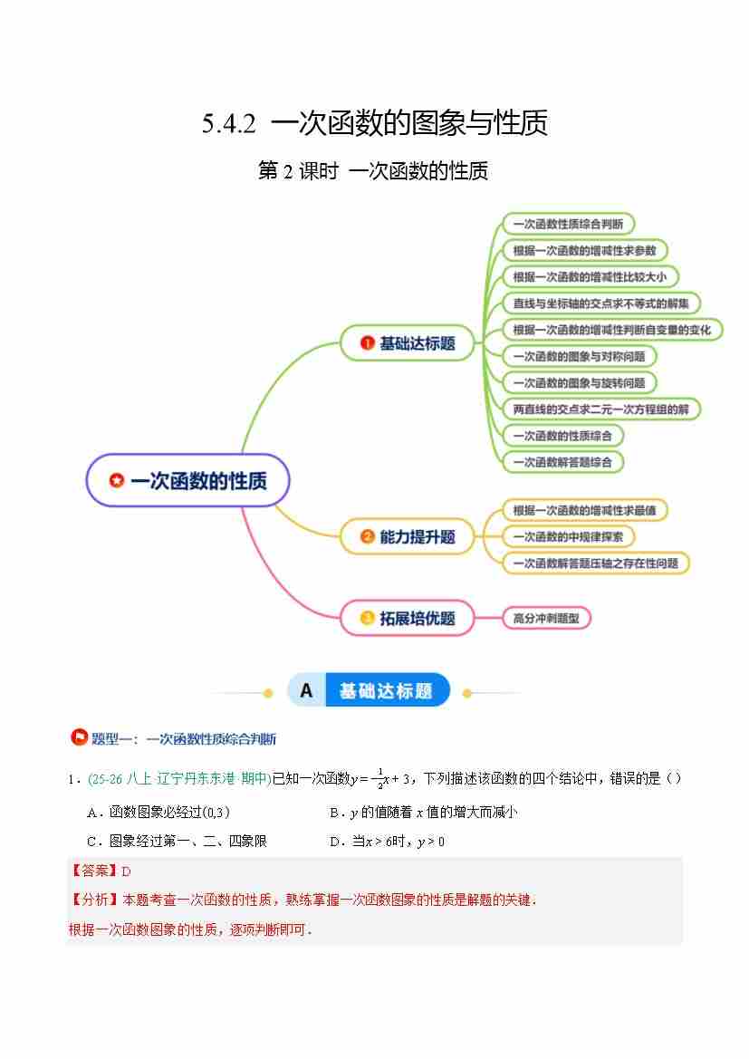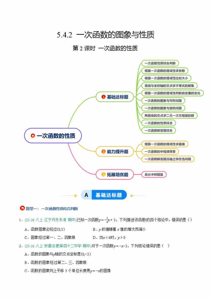 5.4.2 一次函数的图象与性质(第2课时 一次函数的性质)(9大基础题型3大巩固提升)(题型专练)(原卷版)