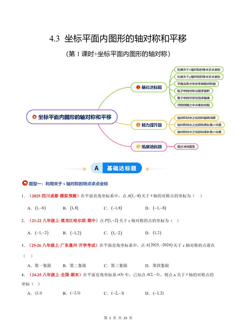 4.3 坐标平面内图形的轴对称和平移(第1课时轴对称)(6大基础题型3大巩固提升)(题型专练)(原卷版)