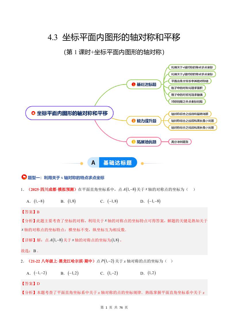 4.3 坐标平面内图形的轴对称和平移(第1课时轴对称)(6大基础题型3大巩固提升)(题型专练)(解析版)