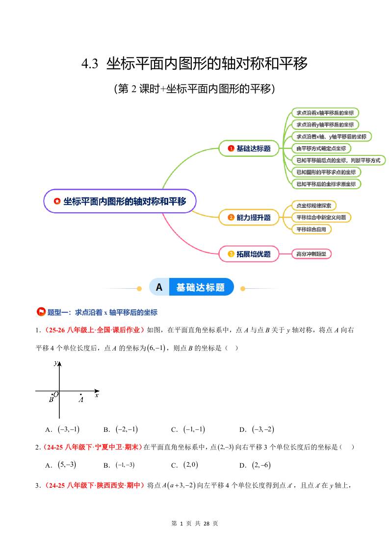 4.3 坐标平面内图形的轴对称和平移(第2课时平移)(7大基础题型3大巩固提升)(题型专练)(原卷版)