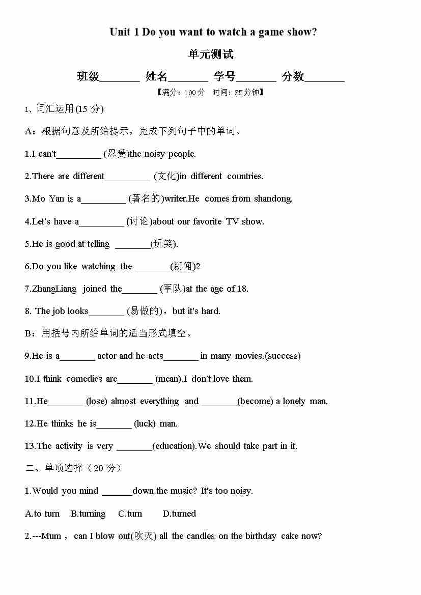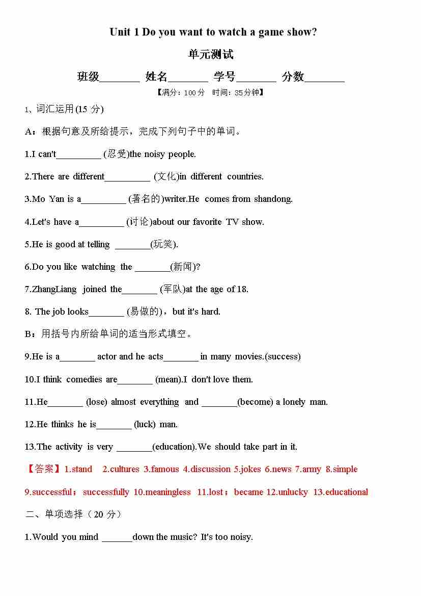 1.10 Unit 1 Do you want to watch a game show 单元测试(解析版)