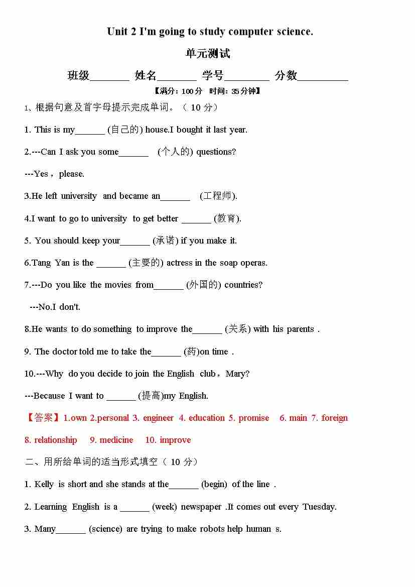 2.10 Unit 2 I'm going to study computer science 单元测试(解析版)
