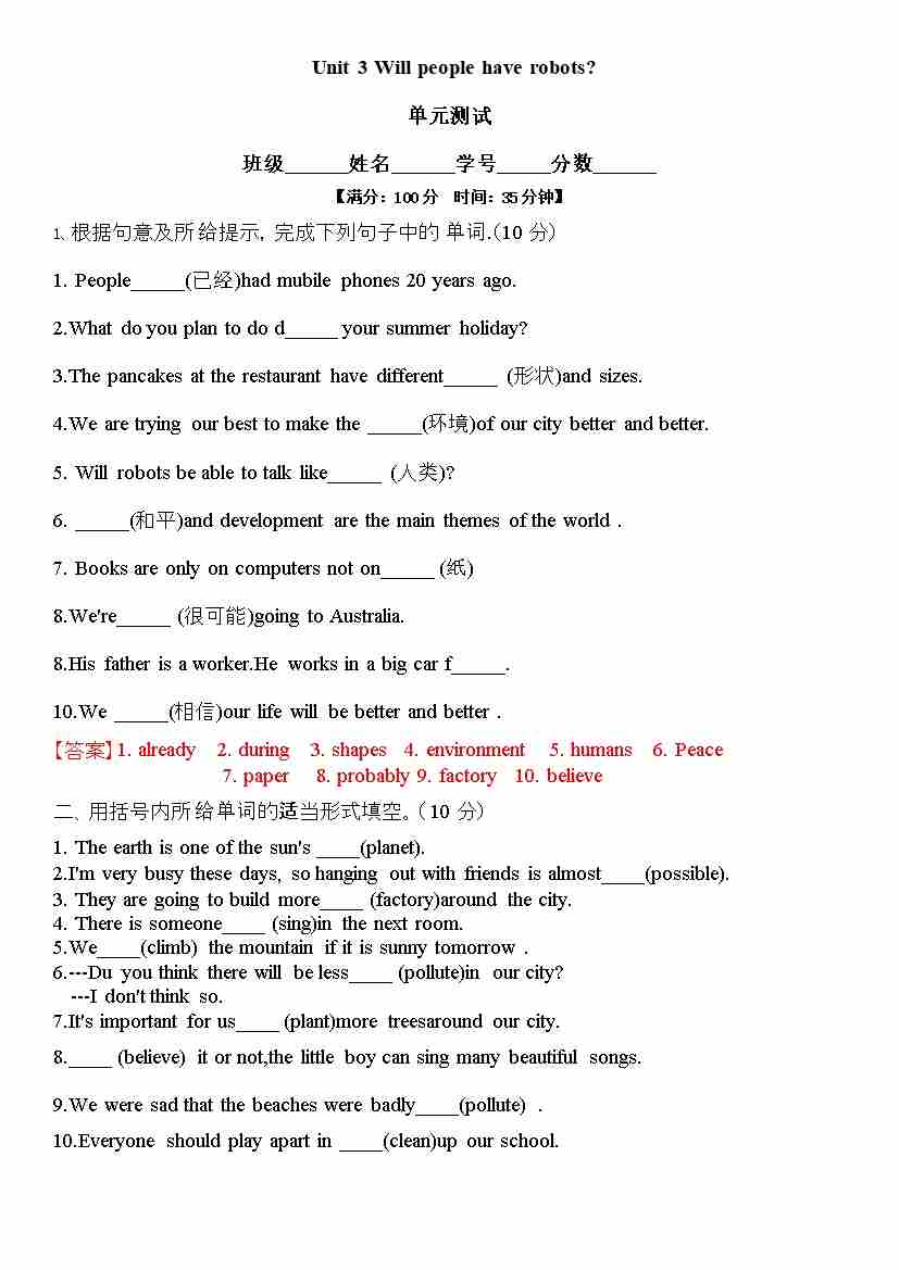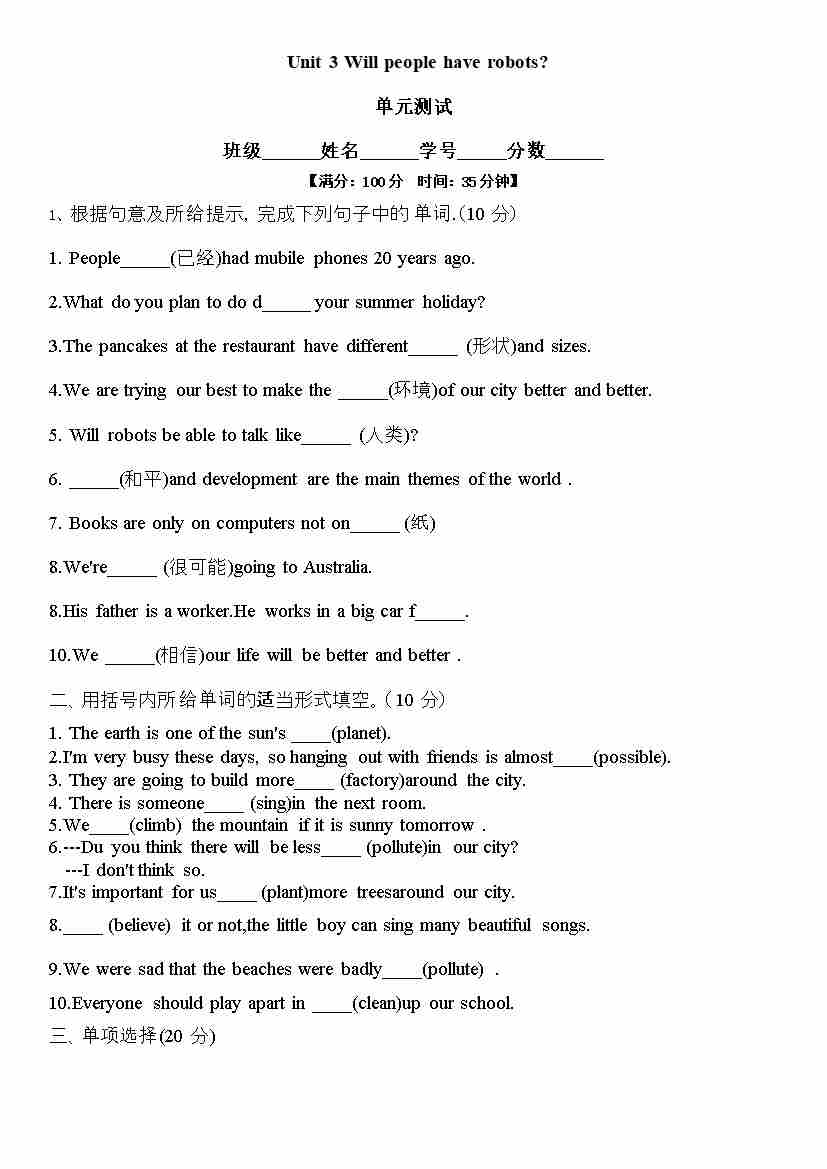 3.10 Unit 3 Will people have robots 单元测试(原卷版)