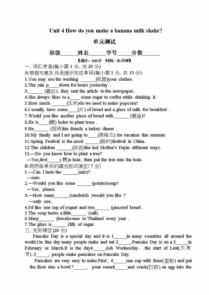 4.10 Unit 4 How do you make a banana milk shake 单元测试(原卷版)