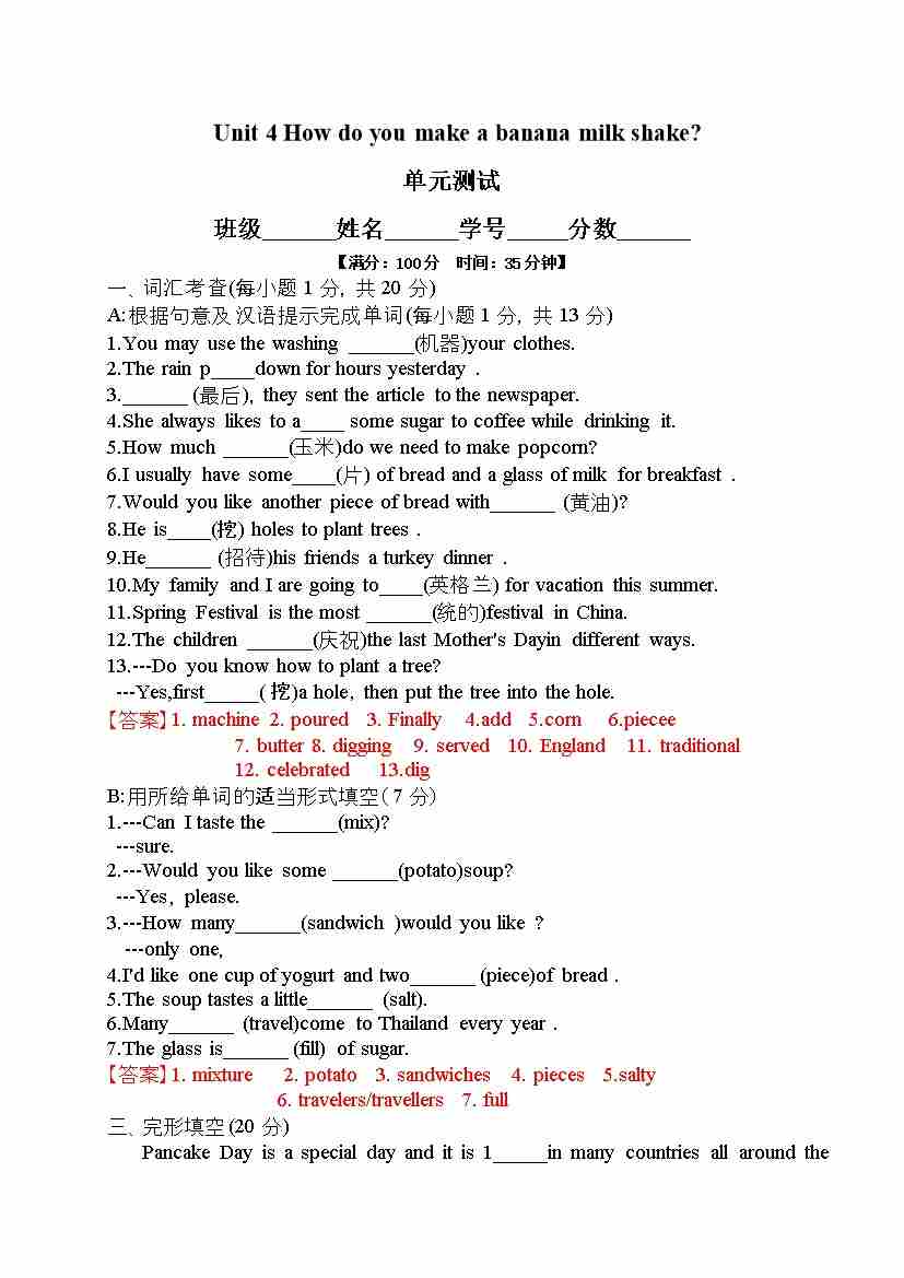 4.10 Unit 4 How do you make a banana milk shake 单元测试(解析版)