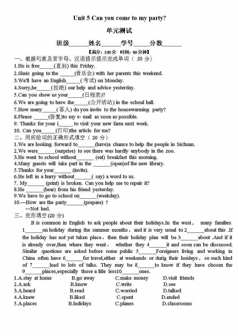 5.10 Unit 5 Can you come to my party 单元测试(原卷版)