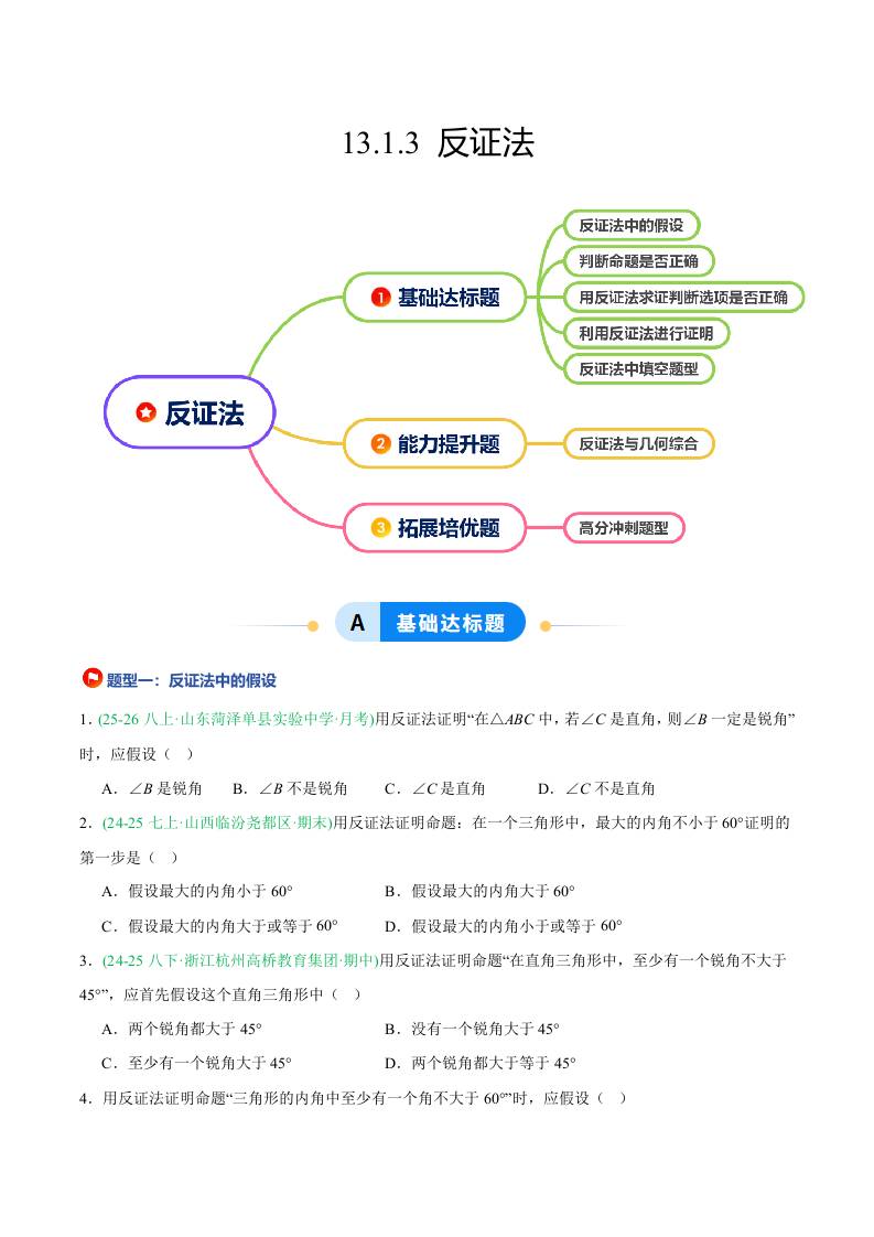 13.1.3 反证法(5大基础题型1大巩固提升)(题型专练) (解析版)