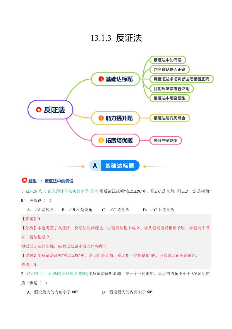 13.1.3 反证法(5大基础题型1大巩固提升)(题型专练) (原卷版)