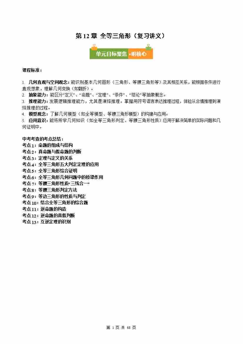 第12章 全等三角形(复习讲义)数学华东师大版2024八年级上册(原卷版)