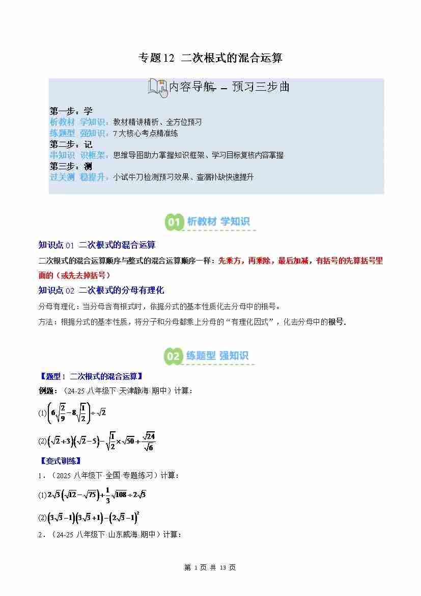 专题12: 二次根式的混合运算(2知识点7大题型思维导图过关测)(原卷版)
