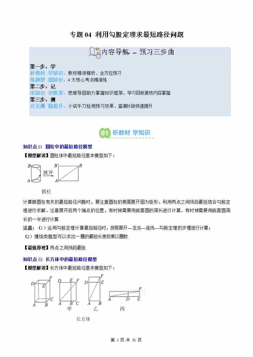 专题04: 利用勾股定理求最短路径问题(4知识点4大题型思维导图过关测)(原卷版)