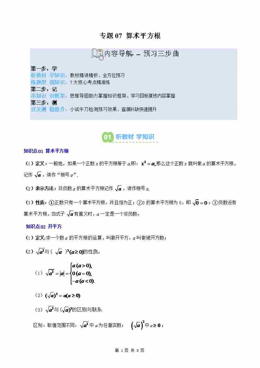 专题07: 算术平方根(2知识点7大题型思维导图过关测)(原卷版)