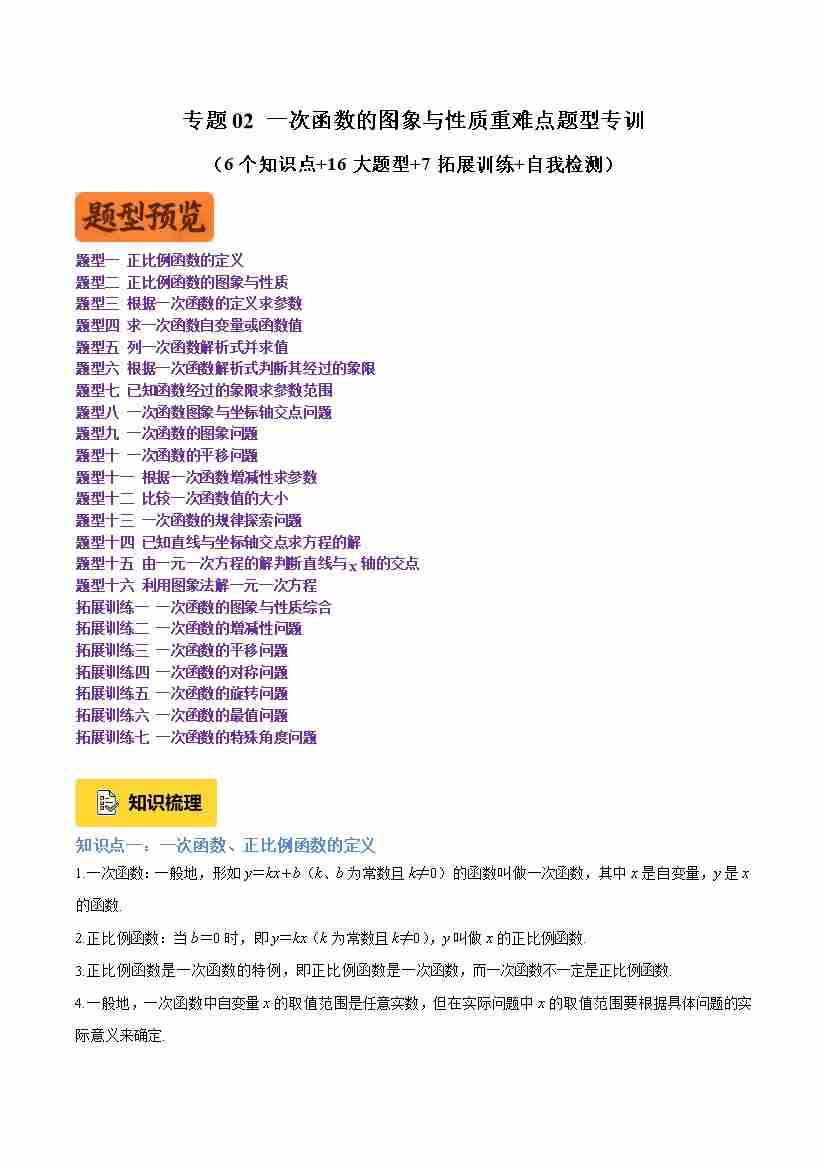 专题02 一次函数的图象与性质重难点题型专训(6个知识点16大题型7大拓展训练自我检测)(学生版)