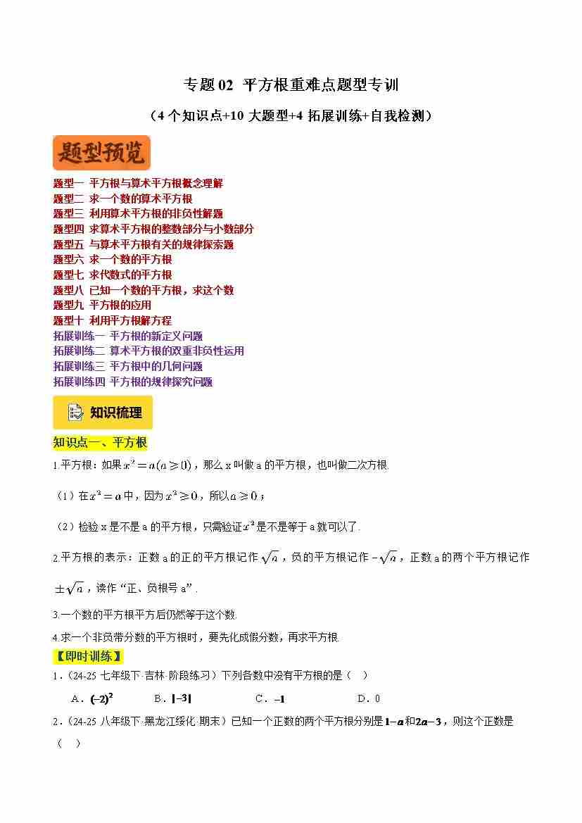 专题02 平方根重难点题型专训(4个知识点10大题型4大拓展训练自我检测)(原卷版)