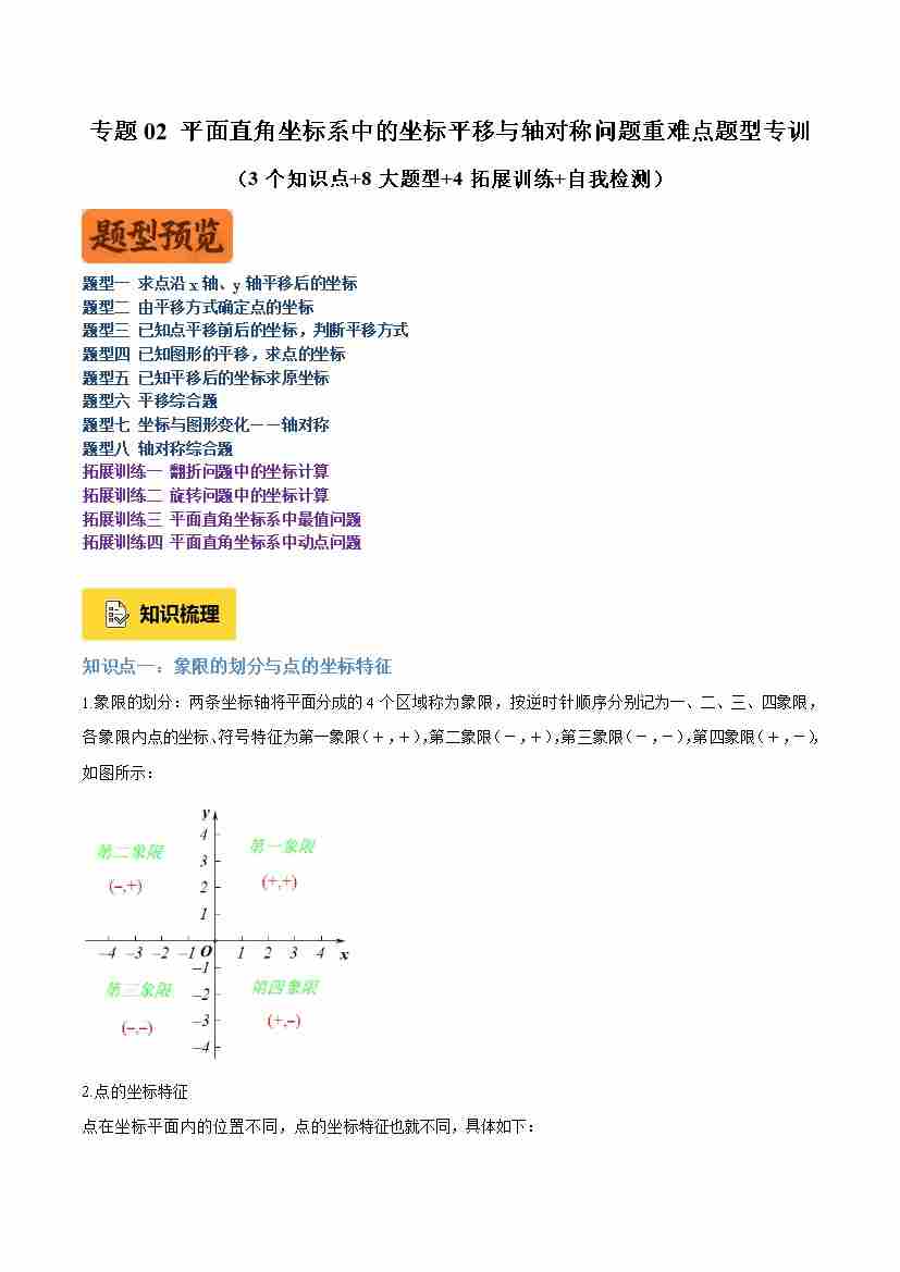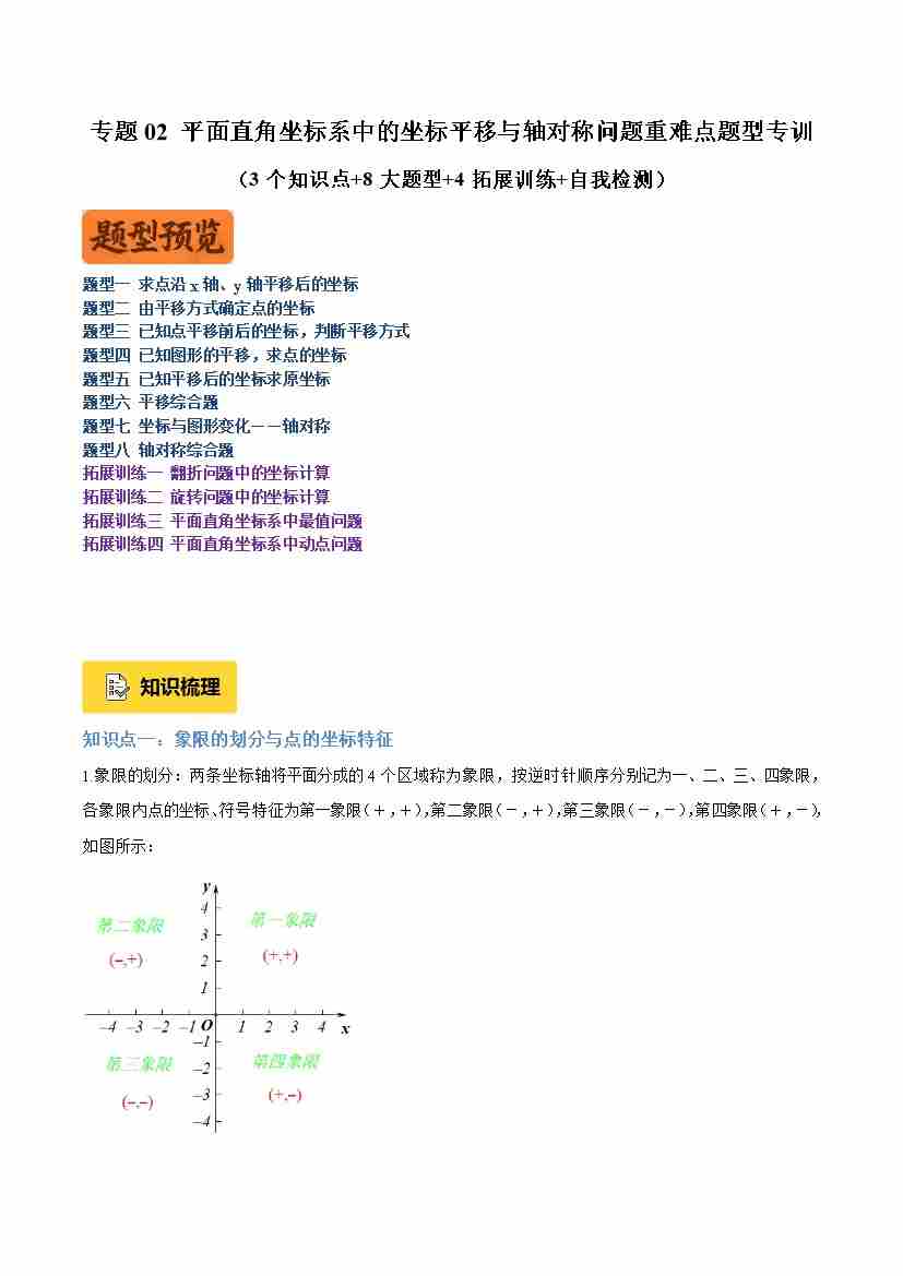 专题02 平面直角坐标系中的坐标平移与轴对称重难点题型专训(3个知识点8大题型4大拓展训练自我检测)(学生版)
