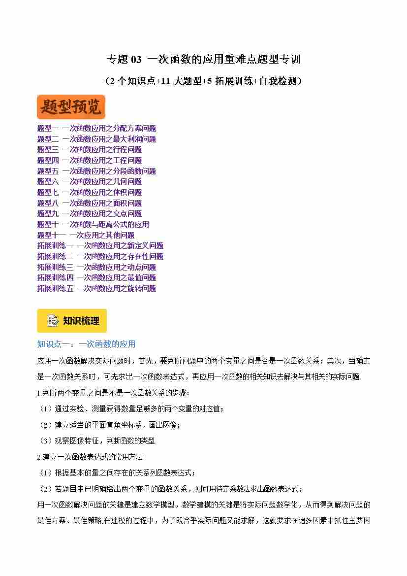 专题03 一次函数的应用重难点题型专训(2个知识点11大题型5大拓展训练自我检测)(学生版)