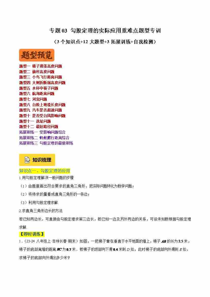 专题03 勾股定理的应用重难点题型专训(3个知识点12大题型3大拓展训练自我检测)(原卷版)
