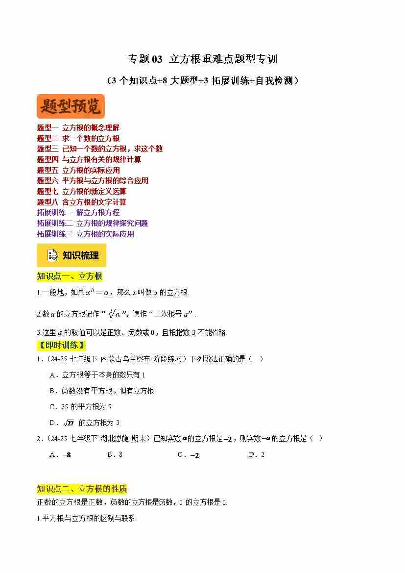 专题03 立方根重难点题型专训(3个知识点8大题型3大拓展训练自我检测)(原卷版)