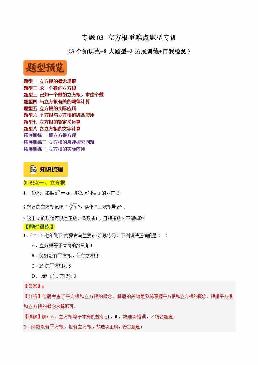 专题03 立方根重难点题型专训(3个知识点8大题型3大拓展训练自我检测)(解析版)