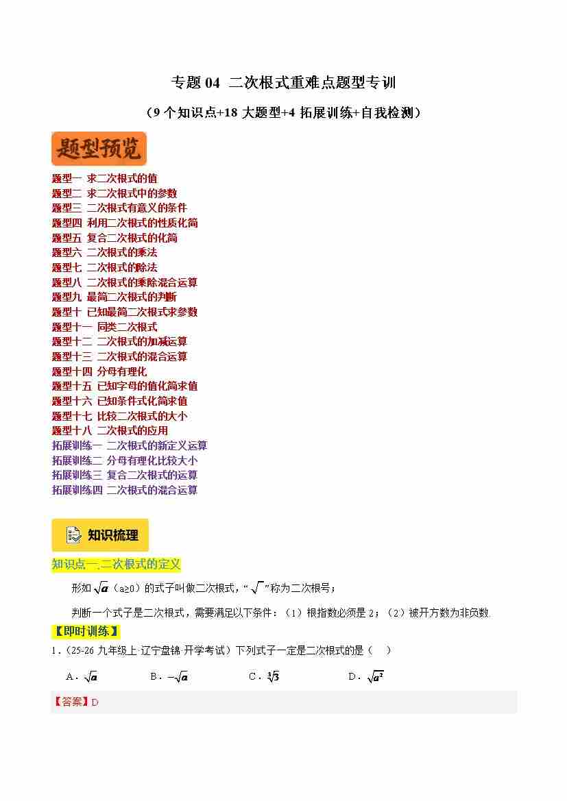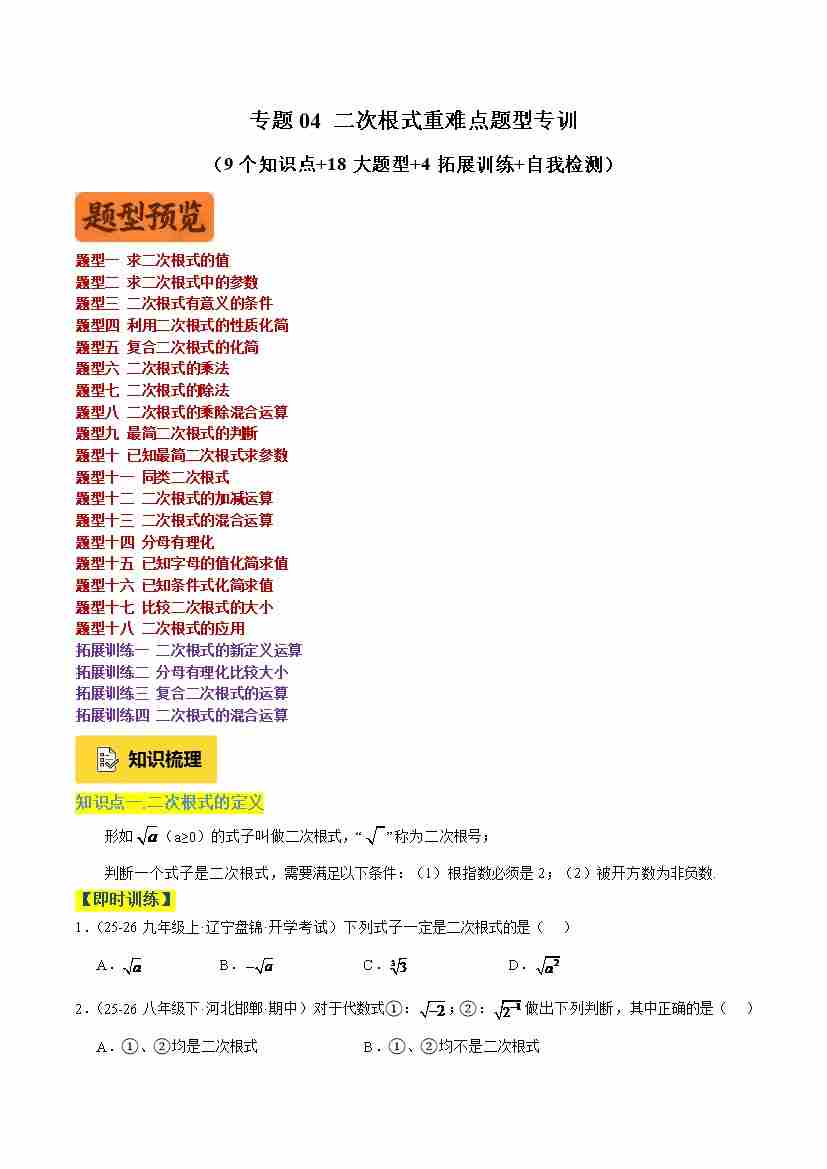 专题04 二次根式重难点题型专训(9个知识点18大题型4大拓展训练自我检测)(原卷版)