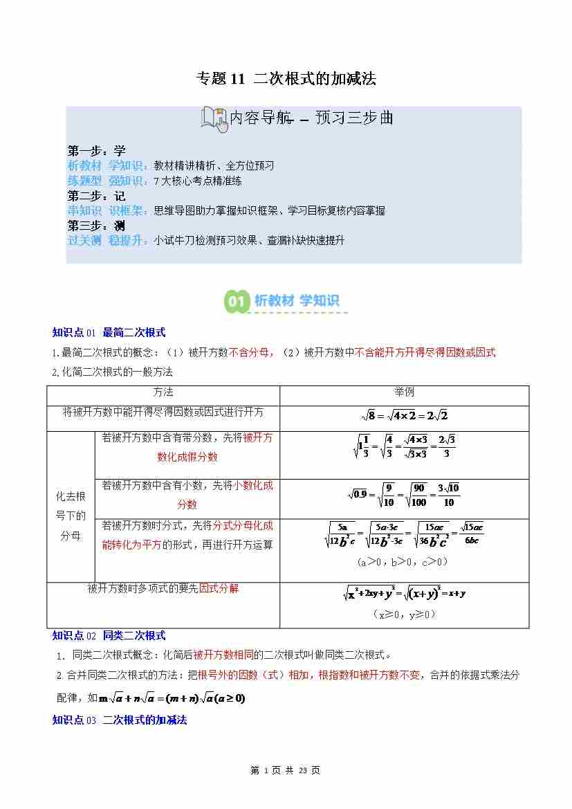 专题11: 二次根式的加减法(3知识点7大题型思维导图过关测)(原卷版)