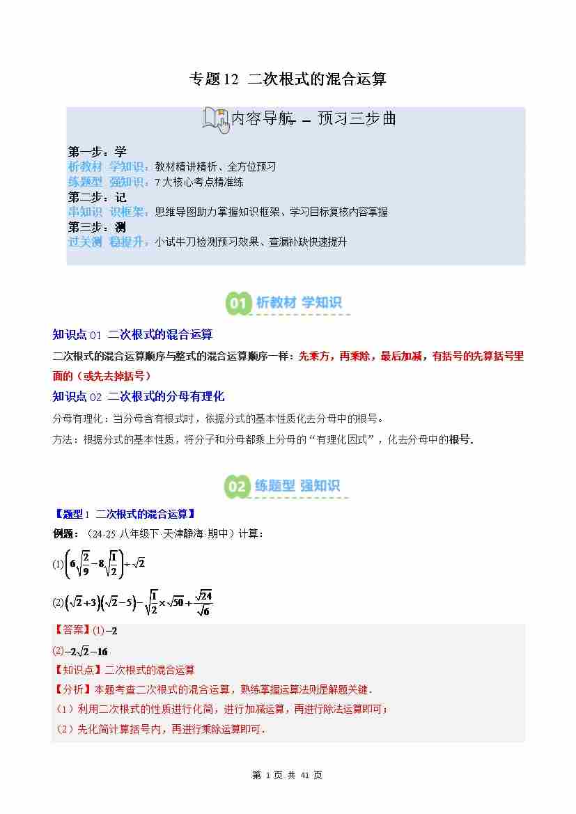 专题12: 二次根式的混合运算(2知识点7大题型思维导图过关测)(解析版)