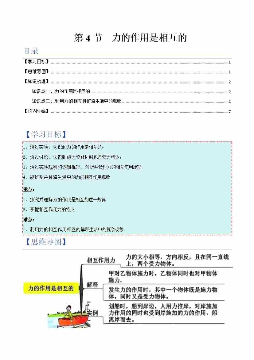 四、力的作用是相互的(举一反三讲义)(原卷版)