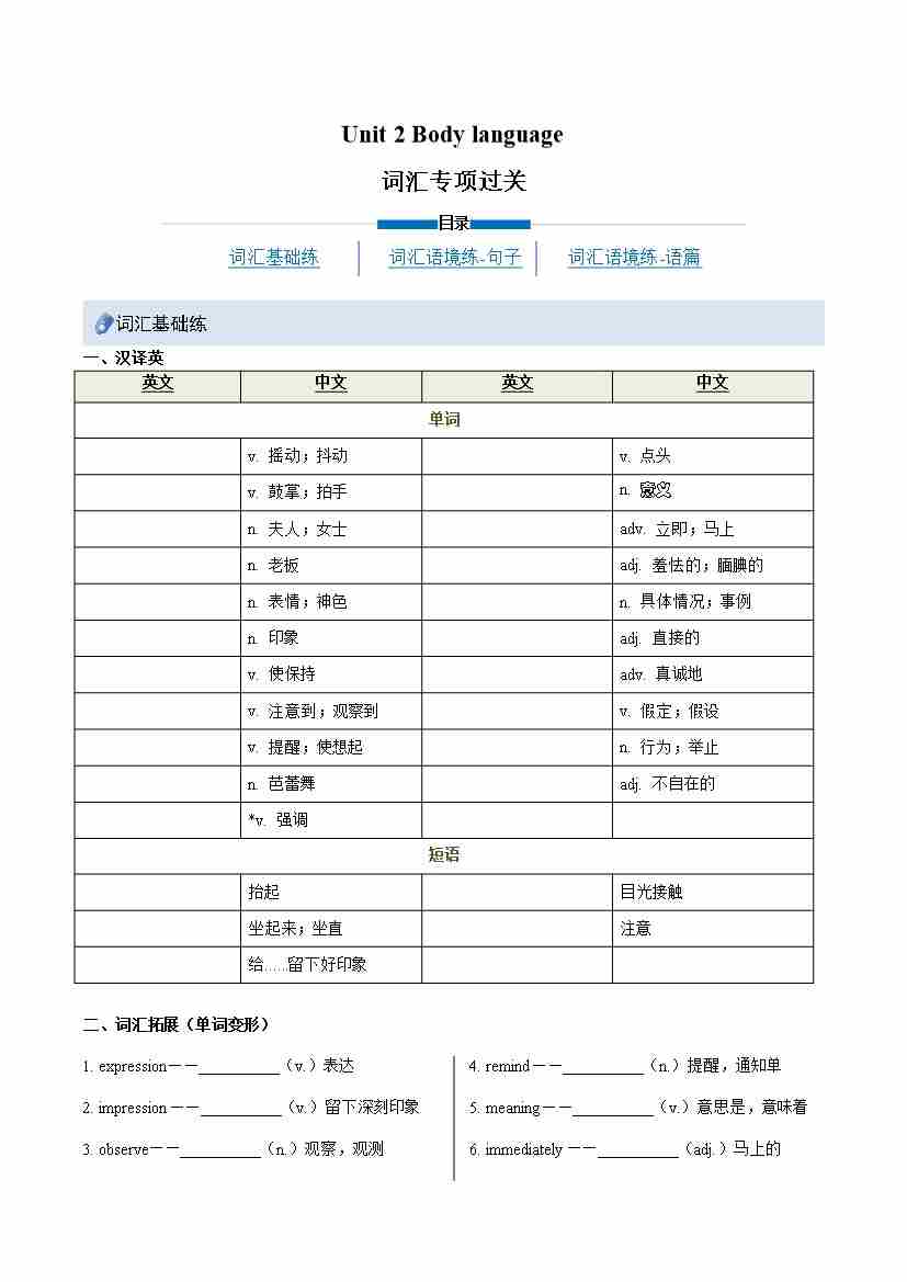 Unit 2 Body language (重难词汇精练)(原卷版)