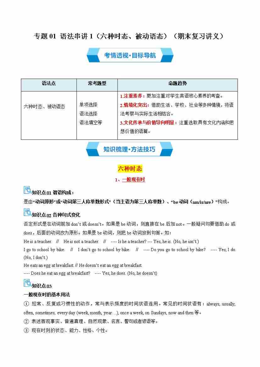 专题01 语法串讲1(六种时态、被动语态)(期末复习讲义)(解析版)