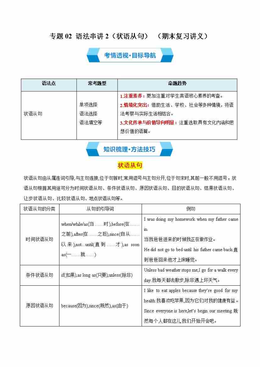 专题02 语法串讲2(状语从句)(期末复习讲义)(原卷版)