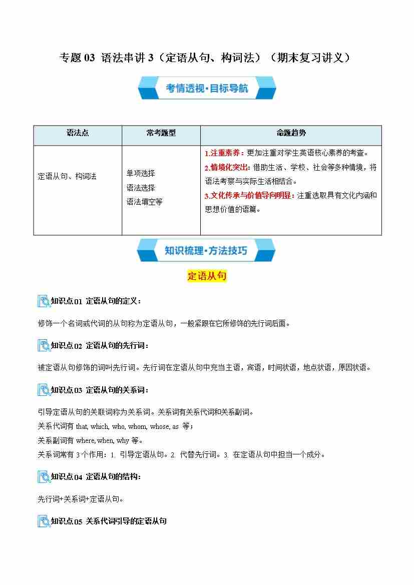 专题03 语法串讲3(定语从句、构词法) (期末复习讲义)(原卷版)