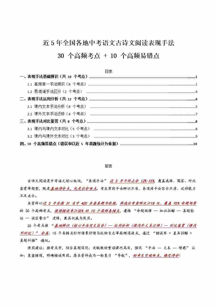 [53910364]近5年全国各地中考语文古诗文阅读表现手法30个高频考点10个高频易错点
