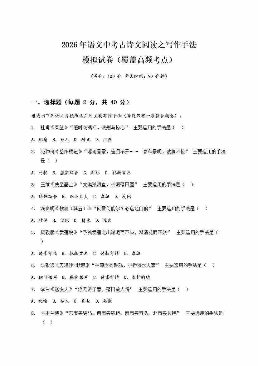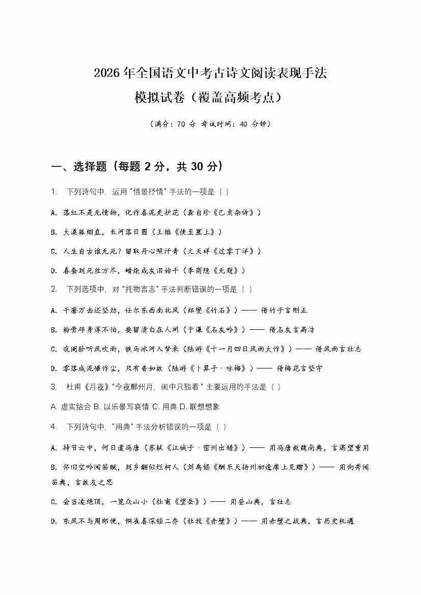 [53910365]2026年全国语文中考古诗文阅读表现手法模拟试卷(覆盖高频考点)
