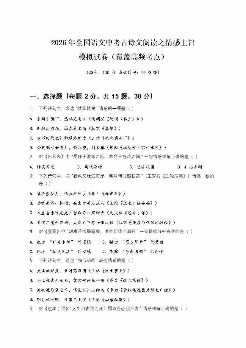 [53921747]2026年全国语文中考古诗文阅读之情感主旨模拟试卷(覆盖高频考点)