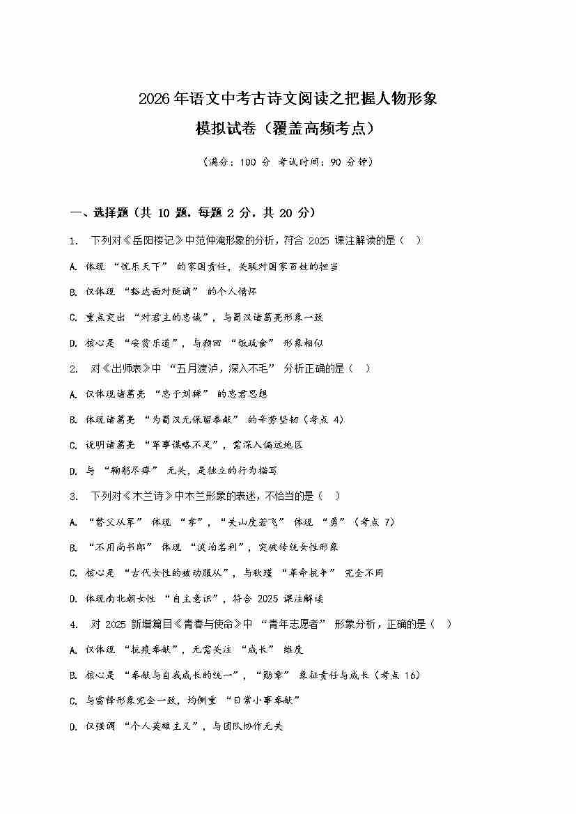 [53957328]2026年语文中考古诗文阅读之把握人物形象模拟试卷(覆盖高频考点)