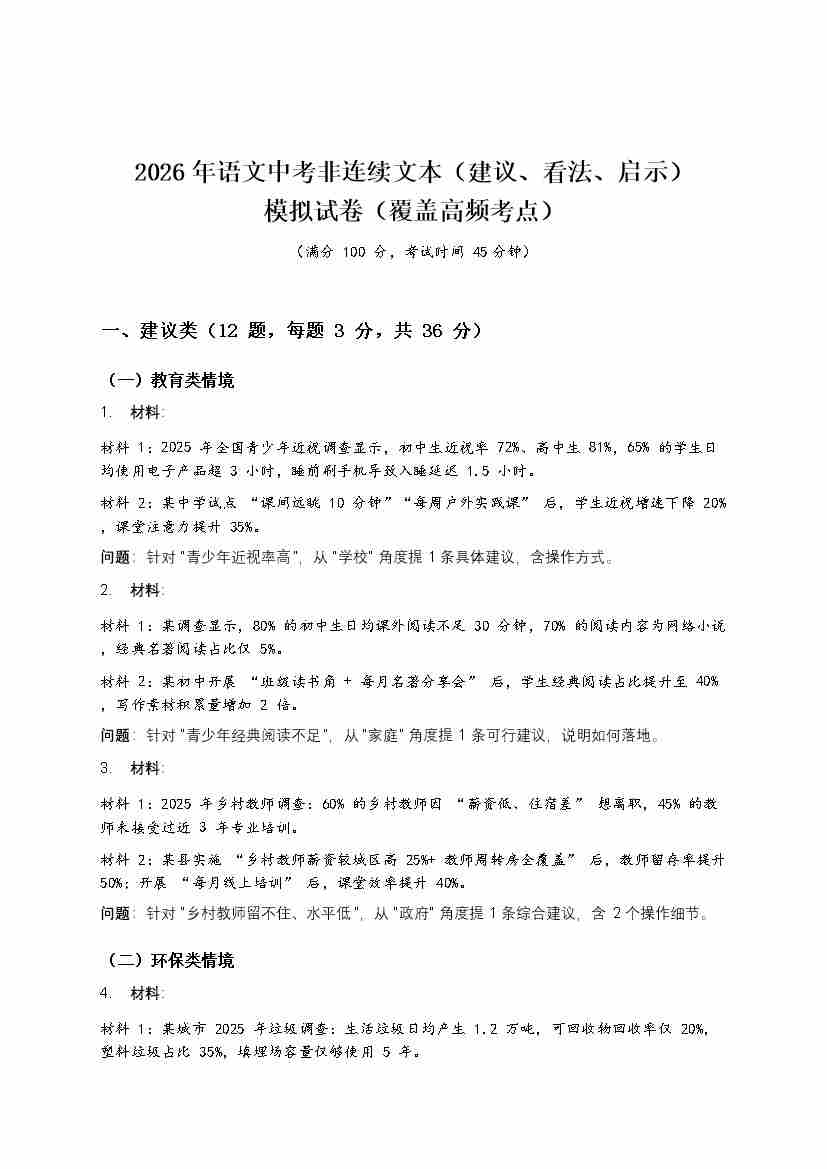 [54073914]2026年语文中考非连续文本(建议、看法、启示)模拟试卷(覆盖高频考点)