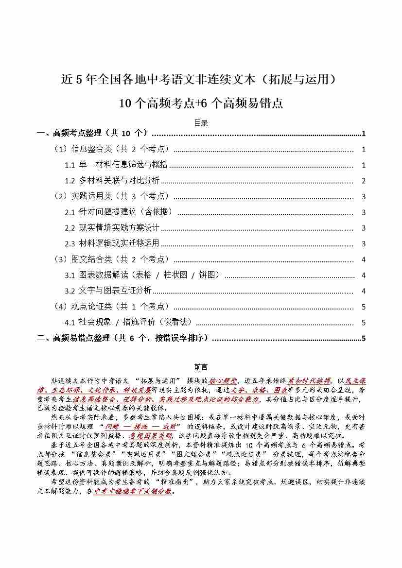 [54135359]近5年全国各地中考语文非连续文本(拓展与运用)10个高频考点6个高频易错点