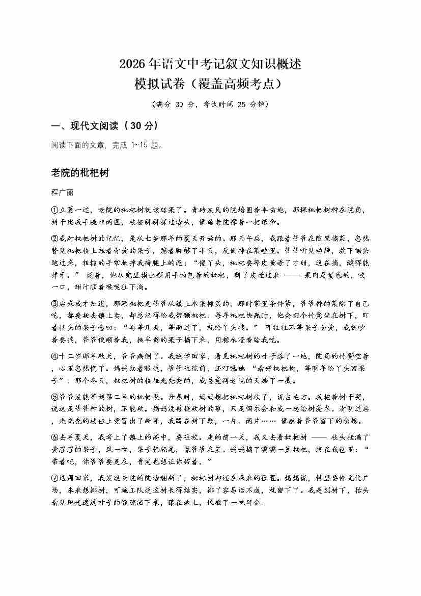 [54179566]2026年语文中考记叙文知识概述模拟试卷(覆盖高频考点)