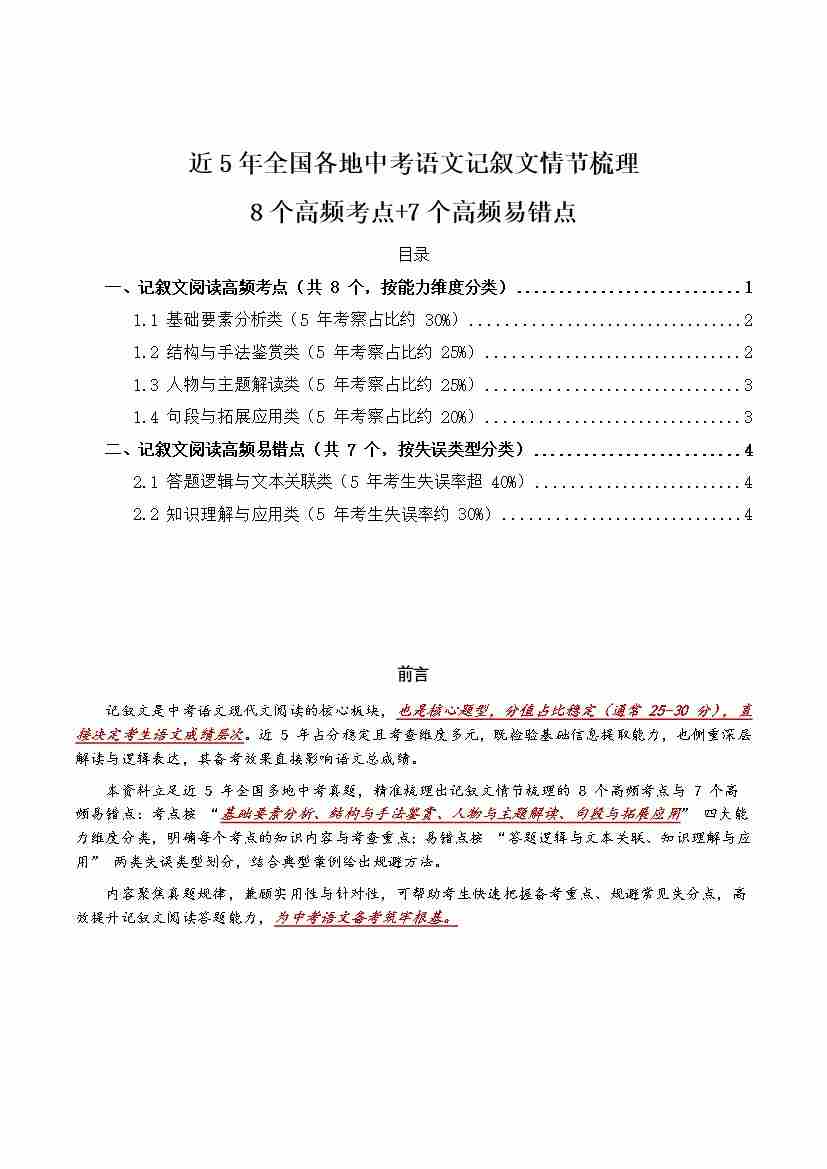 [54255749]近5年全国各地中考语文记叙文情节梳理8个高频考点7个高频易错点