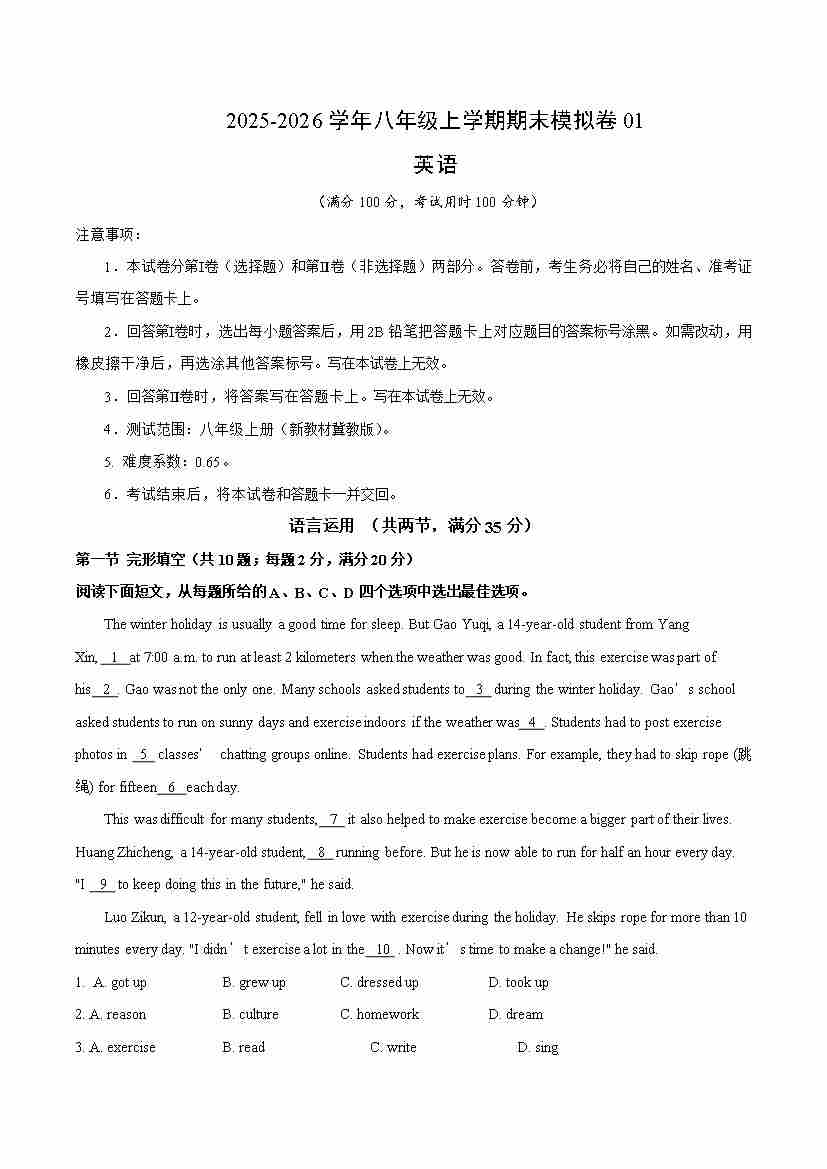 八年级英语上学期期末模拟卷01(新教材冀教版)(考试版 A4)