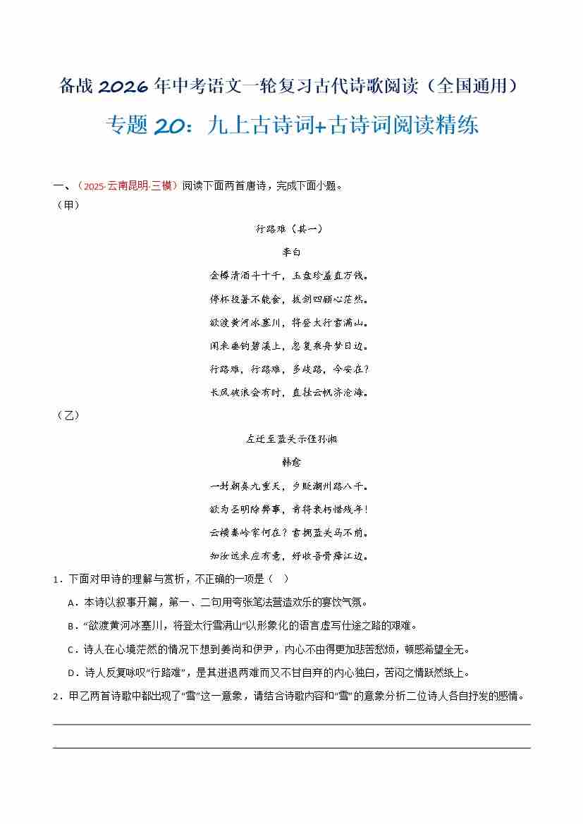 专题20:九上古诗词古诗词阅读精练(练习)原卷版