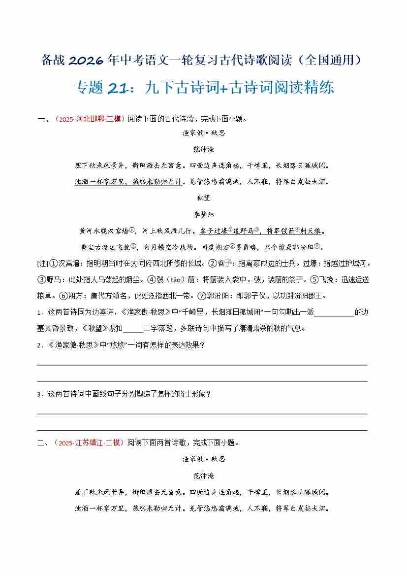 专题21:九下古诗词古诗词阅读精练(练习)原卷版