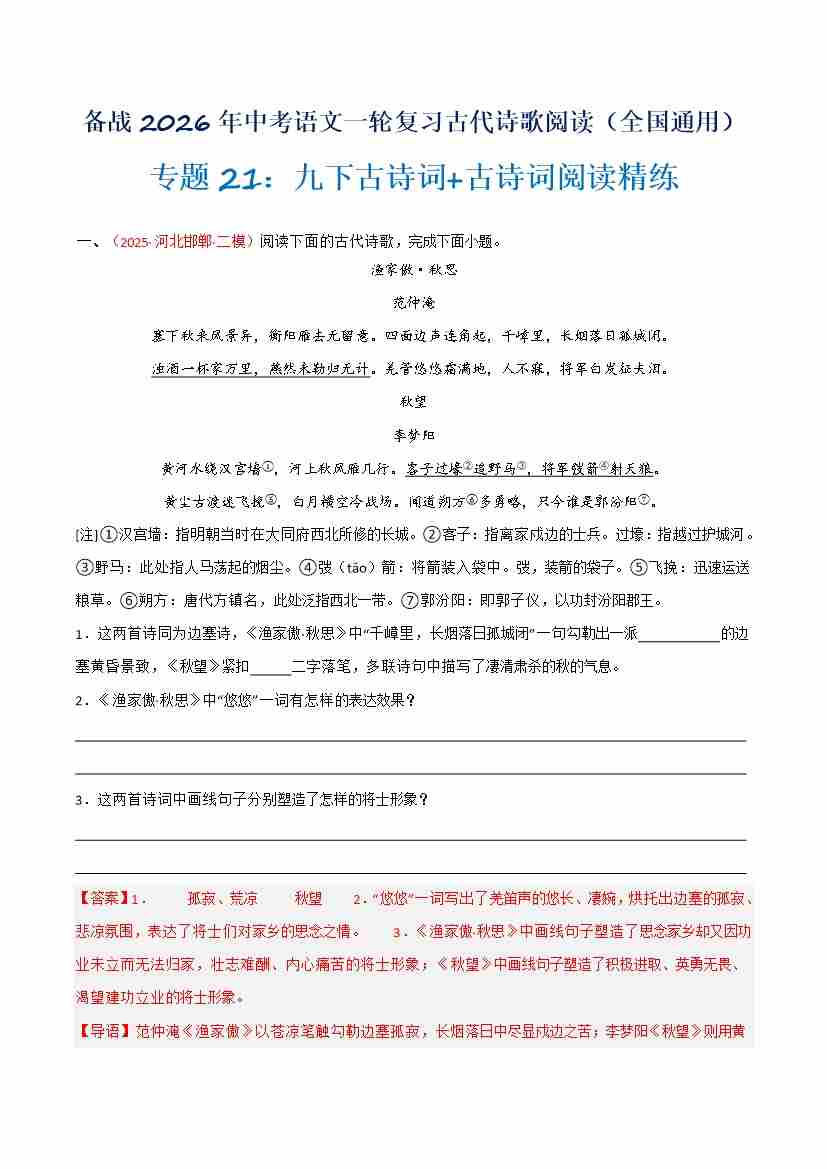 专题21:九下古诗词古诗词阅读精练(练习)解析版