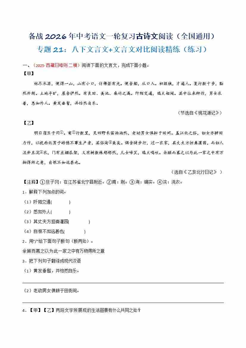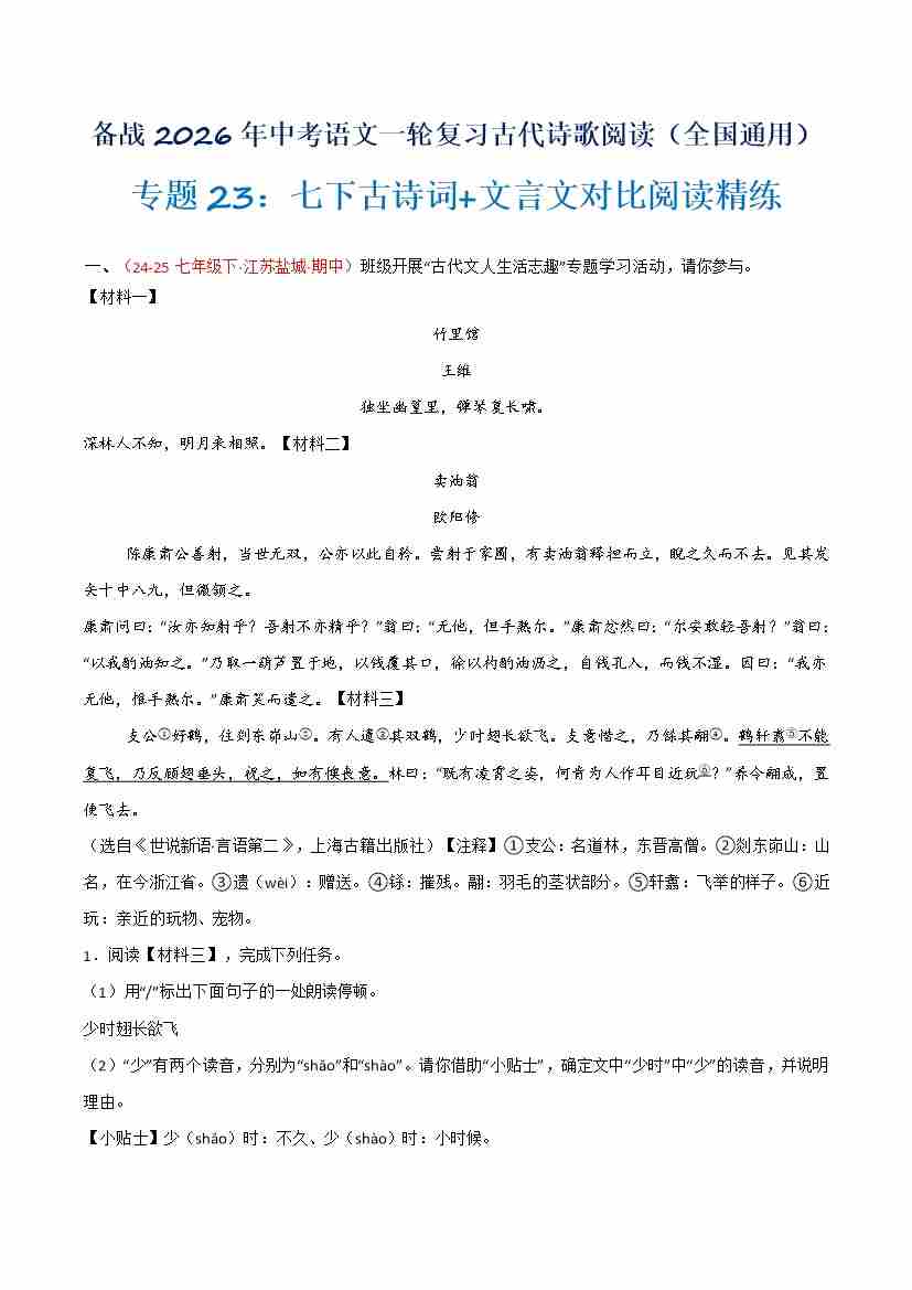 专题23:七下古诗词文言文对比阅读精练(练习)原卷版