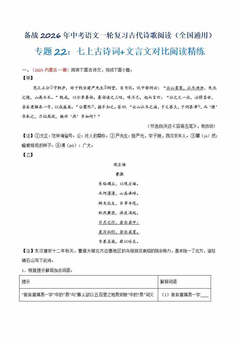 专题22:七上古诗词文言文对比阅读精练(练习)原卷版