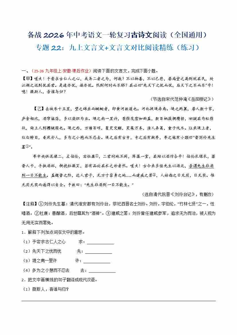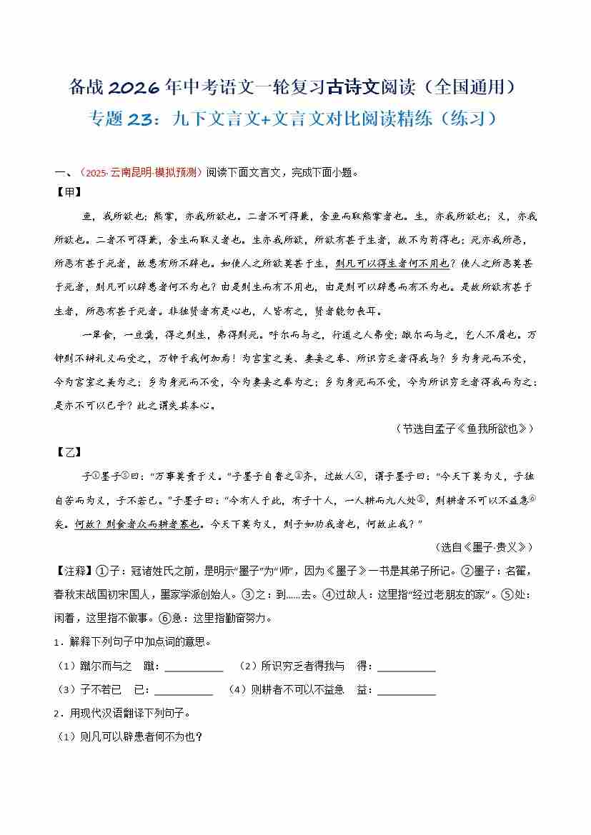 专题23:九下文言文文言文对比阅读精练(练习)原卷版